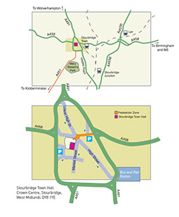 From the North: Exit the M5 at Junction 3 and follow signs for Kidderminster along the A456 for about 3 miles. At the lights, turn right along the A491 Stourbridge Road. At the island, bear left towards the town centre (A491). Join the ring road in the left-hand lane then move to the right-hand lane and follow the line of the buildings. Continue in the right-hand lane then take a sharp right signposted for the Shopping Centre / High Street to join the one-way system through the town centre. Continue along the High Street into Market Street and Stourbridge Town Hall is on your right.